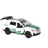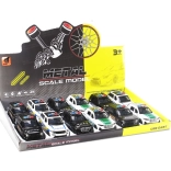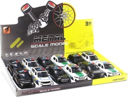 Stoer metalen model van een politiewagen in schaal 1:36 biedt volop plezier: pull-back – trek achteruit en rijden maar, realistisch lichteffect van de lichtbalk en keuze uit 3 designs.