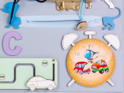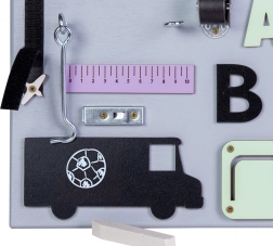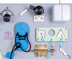 Ontdek een leuke en leerzame speelset voor de kleintjes – een houten manipuleerbord dat de fijne motoriek en het logisch denken ontwikkelt. Dankzij vele alledaagse elementen kunnen kinderen veilig oefenen met vast- en losmaken, draaien, schuiven en veterstrikken, en zo oog-handcoördinatie en concentratie trainen. Het bord kan worden neergezet, neergelegd of aan de muur worden opgehangen.