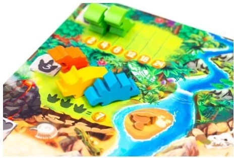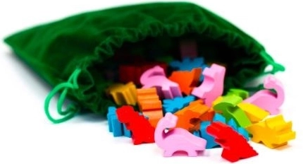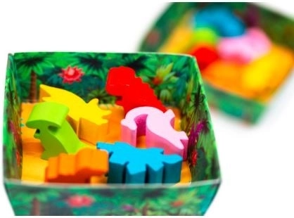 - 5 dubbelzijdige speelborden, 60 houten dinosaurus-meeples (6 soorten), speciale dobbelsteen, schaaltjes voor meeples, trekzak voor het trekken van dinosaurussen