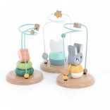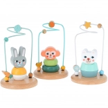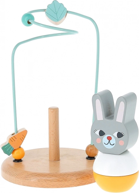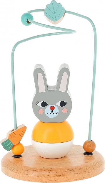 Deze houten doolhof met metalen baan en een konijntjes-figuurtje biedt een leuke activiteit waarbij kinderen kralen en vormen (worteltje, blaadje) over een golvend traject schuiven. Het speelgoed ondersteunt de ontwikkeling van de fijne motoriek, concentratie en geduld, en is tegelijk veilig en stabiel dankzij de stevige houten basis.