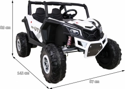 Krachtige en stijlvolle kinderbuggy UTV-MX met 4x4-aandrijving, een 24 V/7 Ah-accu en grote EVA-wielen biedt een soepele soft start, LED-verlichting, een comfortabel kunstleren zitje met gordels en uitgebreide audiofuncties waaronder Bluetooth, USB en MP3. Inclusief een veilige 2,4GHz afstandsbediening voor ouders en een praktische achterste opbergvak/kofferbak voor kleine spullen.