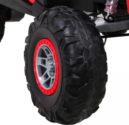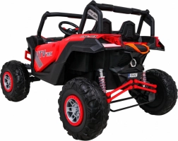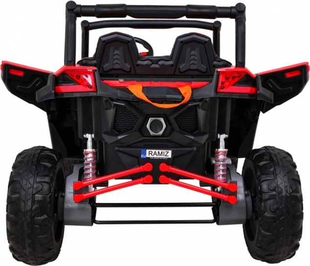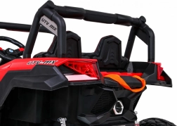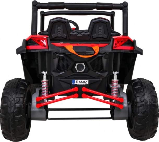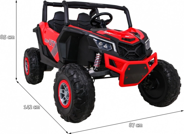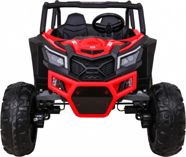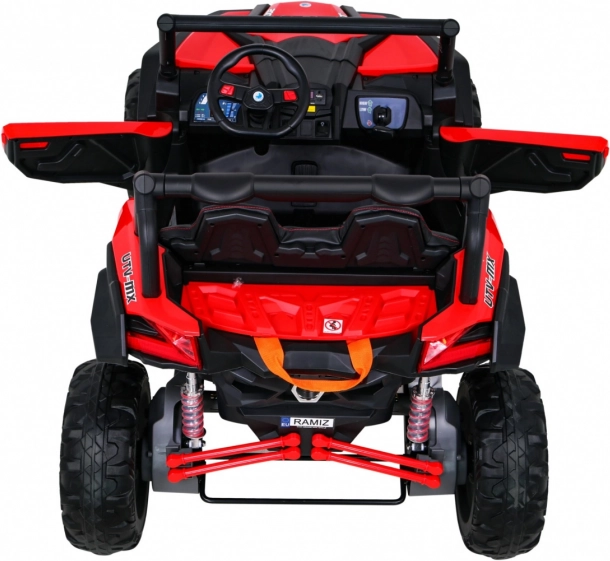 De UTV-MX is een ruime tweezits elektrische kinderauto, ontworpen voor leuk en veilig rijden, ook buiten verharde paden. Dankzij vier 60 W-motoren (totaal 240 W) en het hoge chassis met voor- en achtervering kan hij moeiteloos over ruw terrein. De soepele wegrit (Soft Start) biedt comfort zonder schokken en de LED-verlichting verhoogt de zichtbaarheid en geeft een aantrekkelijke look.