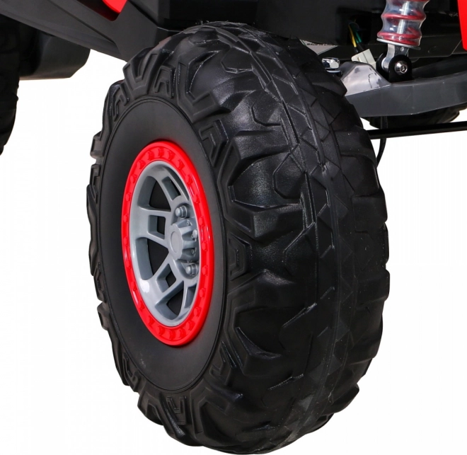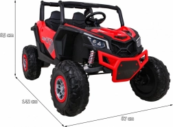 Comfort wordt gegarandeerd door de grote EVA-wielen 39 × 14 cm, zwarte geventileerde eco-leren stoelen met veiligheidsgordels en een achteropbergvak van 40 × 10 × 14 cm voor kleine spullen. Met een draagvermogen tot 50 kg, bodemvrijheid van 29 cm en afmetingen van 142 × 87 × 85 cm is de UTV-MX een geweldige keuze voor broers en zussen of vriendjes.