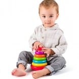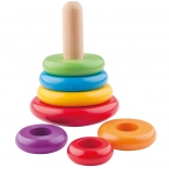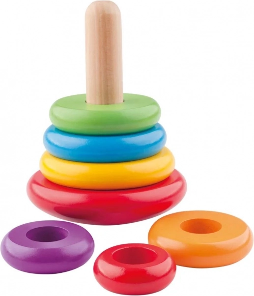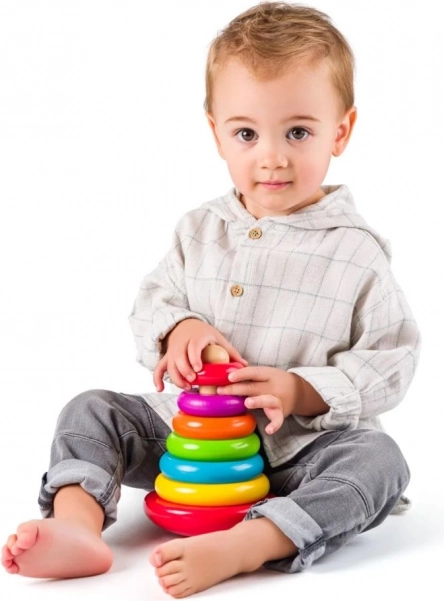 Dit speelgoed combineert twee geweldige manieren van spelen: als piramide en als tol. Kinderen rijgen de kleurrijke houten ringen op de stok van groot naar klein en ontwikkelen zo creativiteit en fijne motoriek. Daarnaast kun je het speelgoed als tol laten draaien, wat een extra laag speelplezier toevoegt.