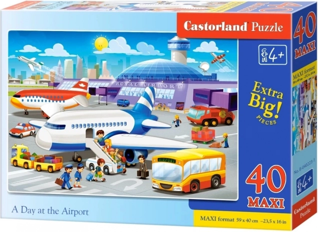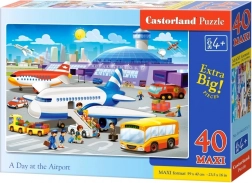 Kleurrijke maxi puzzel voor kinderen met het thema EEN DAG OP HET VLIEGVELD: 40 grote stukjes voor eenvoudig leggen, uiteindelijke afmeting 59 × 40 cm. Kwalitatieve afwerking van Castorland stimuleert fijne motoriek, concentratie en verbeeldingskracht. Geschikt vanaf 4 jaar.