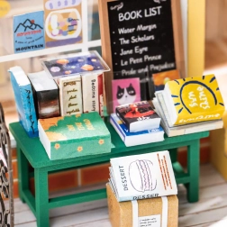 Plankjes met boekjes, een schattige beer, bloemen en accessoires – elk detail draagt bij aan de realistische en betoverende uitstraling van de mini-boekhandel.