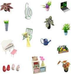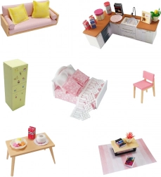 De set bevat miniatuurmeubels die het huisje een realistische uitstraling geven.
