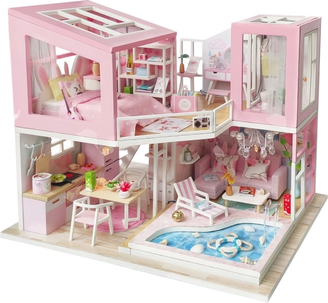 Wij presenteren u een prachtige bouwset van het miniatuurhuisje Villa van de Eerste Ontmoeting. Deze unieke set biedt uren plezier met monteren, lijmen en afwerken, waarbij het resultaat een prachtig model is dat een originele decoratie voor uw woning wordt. Elke set wordt geleverd in ongelijmde staat met LED-verlichting, die uw miniatuurvilla een realistische uitstraling geeft. De verpakking bevat alle benodigde componenten en praktische hulpmiddelen zoals lijm, een liniaal en een pincet voor eenvoudige assemblage.