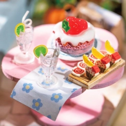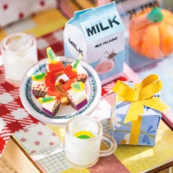In de doos vind je lijm, verf, een penseel en kleine accessoires. Er wachten je schattige mini-decoraties – ballonnen, bloemen, meubels en etalages met opschriften.
