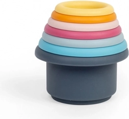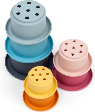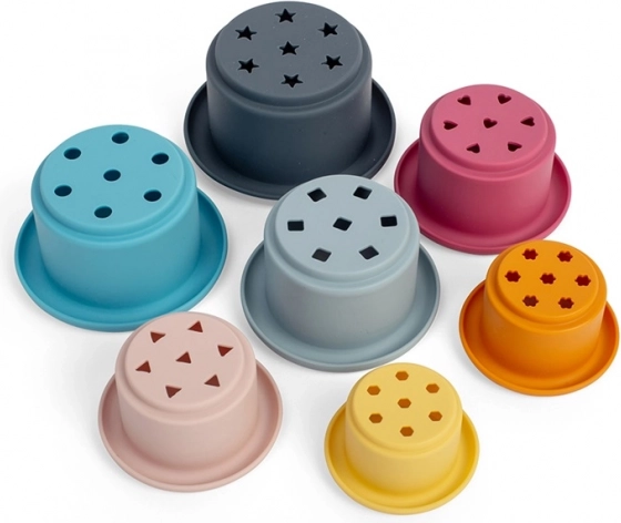 Kleurrijke set van zeven stapelbekers van 100% food-grade siliconen zonder plastic. Ideaal voor in het bad, in het zand en voor thuis. De geperforeerde bodems creëren een watervaleffect; kinderen oefenen zo hun fijne motoriek, oog-handcoördinatie en kleuren herkennen. Het materiaal is duurzaam, niet-toxisch, makkelijk schoon te maken en vaatwasserbestendig.
