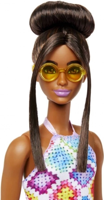 De BARBIE Fashionistas pop viert diversiteit en een eigen stijl. Ze draagt een opvallende jurk met een geometrisch patchworkpatroon die zelfs op sombere dagen kleurrijk straalt. Het elegante kapsel met knot en lokken rond het gezicht wordt aangevuld met stijlvolle bril en modieuze sandalen – klaar voor elk avontuur.