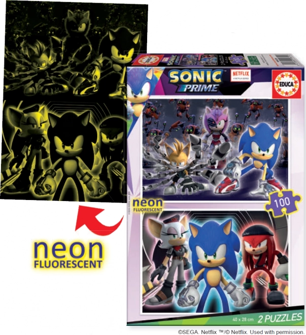 Geniet van plezier met twee neonpuzzels van Sonic Prime van EDUCA, die in het donker oplichten dankzij een speciale fluorescerende laag. Elke puzzel heeft 100 stukjes en afmetingen van 40 x 28 cm.