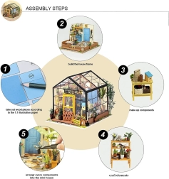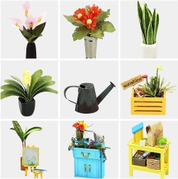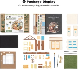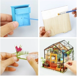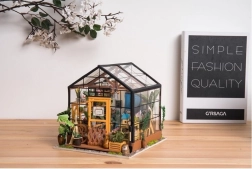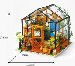Ontdek de magie van miniaturen met het model Robotime Mini Kas. In de doos vind je voorgesneden multiplex onderdelen, papieren prints, stoffen en metalen elementen die na het verven en lijmen een indrukwekkende kas vormen vol plantjes en tuindecoraties. LED-verlichting geeft het afgewerkte model een warme en gezellige sfeer.
