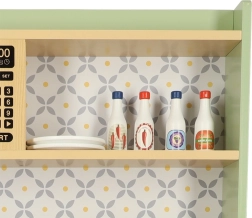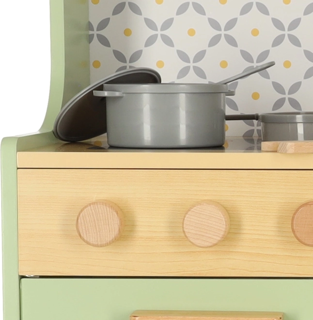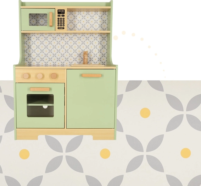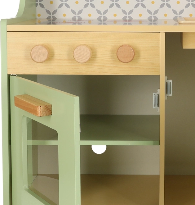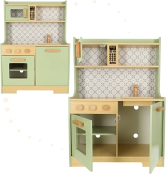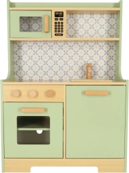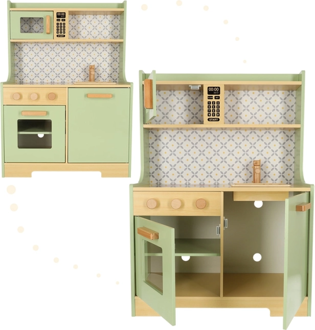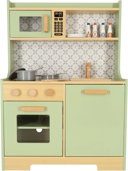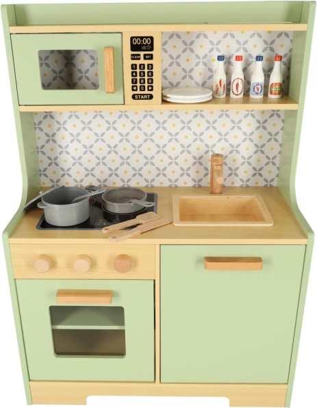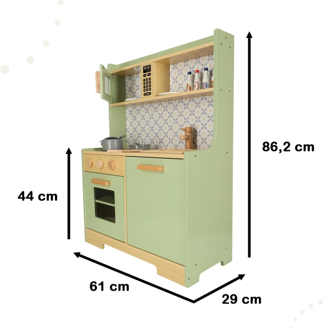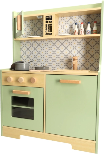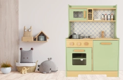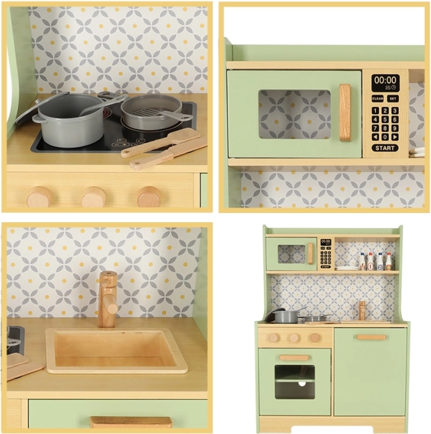 Laat kinderen hun ouders nadoen in een veilige omgeving met de muntkleurige houten keuken. Bevat alle essentiële elementen zoals een oven, magnetron, beweegbaar fornuis en gootsteen, die realistische geluiden maken voor een levensechte kookervaring.