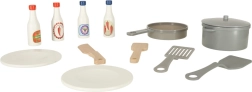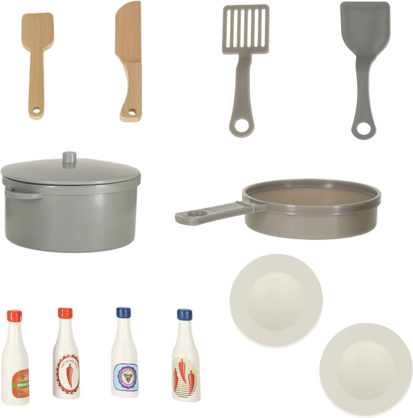 De set omvat een rijke set accessoires, waaronder een kunststof koekenpan, pan met deksel, houten bestek en borden. Voor het perfectioneren van de gerechten zijn er ook vier verschillende soorten sauzen.