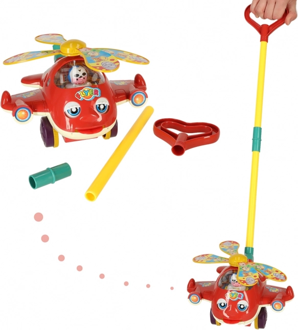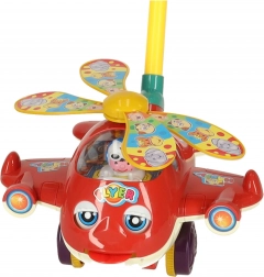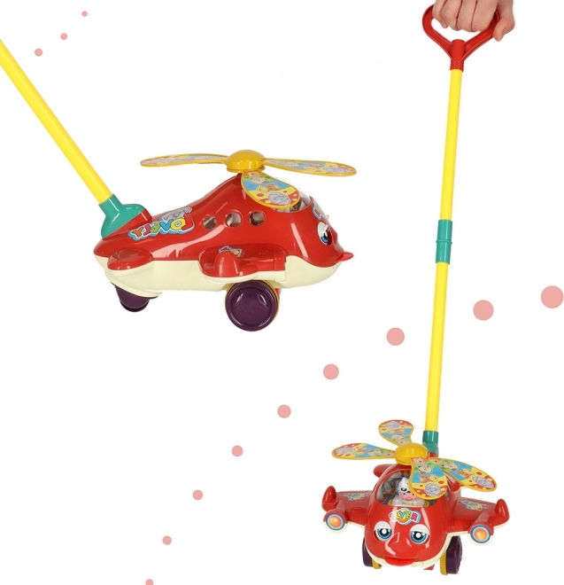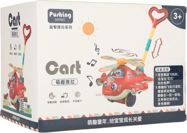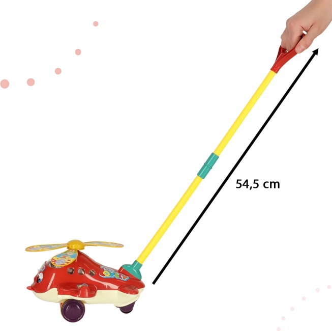 Het speelgoedontwerp omvat levendige kleuren en vrolijke motieven, waarmee het de aandacht van kinderen trekt. De rode helikopter draait met zijn propellers en maakt belachtige geluiden tijdens het bewegen. De steunbalk is ontworpen om aan de hoogte van het kind te voldoen en kan eenvoudig worden opgevouwen voor handige opslag of transport.