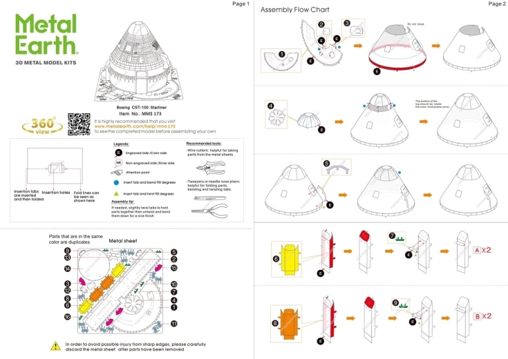 Druk de afzonderlijke onderdelen uit de metalen plaatjes; gebruik indien nodig een kleine zijkniptang (niet inbegrepen). De onderdelen worden met elkaar verbonden door middel van vergrendelingen bestaande uit een lipje en een opening. Buig het lipje om met een kleine punttang (niet inbegrepen) en verbind stap voor stap alle vergrendelingen totdat er een zeer realistisch meesterwerk ontstaat!
