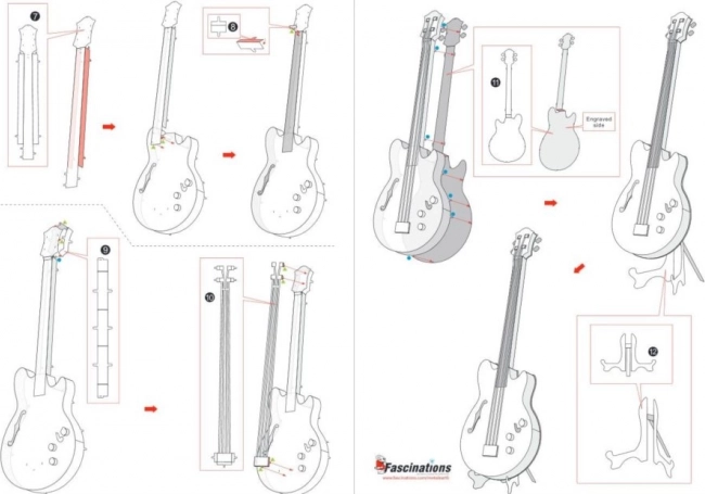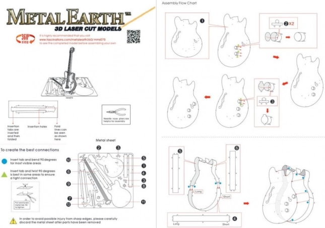 Haal de afzonderlijke onderdelen uit de metalen plaatjes; gebruik indien nodig een kleine zijkniptang (niet inbegrepen). De onderdelen worden met elkaar verbonden via vergrendelingen die bestaan uit een lipje en een opening. Buig het lipje om met een kleine punttang (niet inbegrepen) en verbind stap voor stap alle vergrendelingen totdat er een zeer realistisch meesterwerk ontstaat!