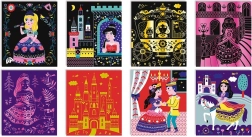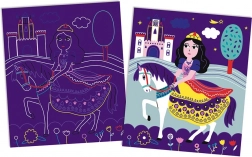 De set bevat acht voorgedrukte kaarten met prinsessen, kastelen en magische scènes. Elk motief inspireert kinderen om te creëren en hun eigen verhalen te vertellen.