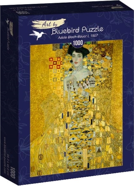 Bluebird puzzel Dame in het goud – Gustav Klimt, 1000 stukjes. Nauwkeurige druk, precieze uitsnijdingen, eindformaat 48 × 68,3 cm. Ideaal om in te lijsten.