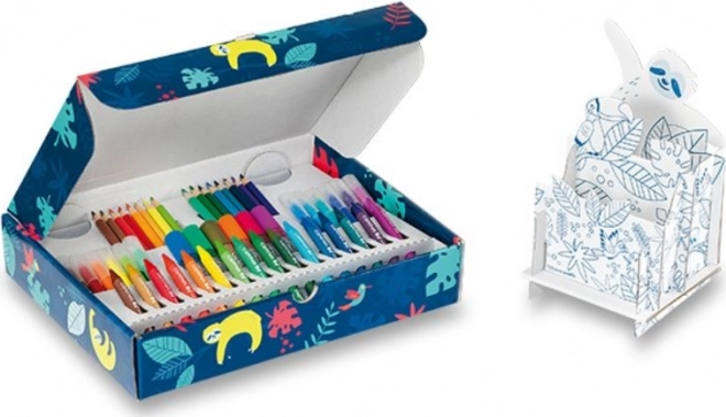 - 16 Strong kleurpotloden, 16 waskrijtjes, 12 Jungle stiften, 6 tubes met glitterlijm, 1 kartonnen pennenhouder om in te kleuren