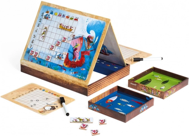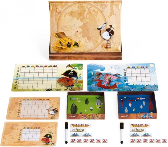 Magnetisch piratenschepenspel JANOD: 2 roosters, 20 magnetische schepen en 2 uitwisbare stiften. Leuk strategisch spel voor kinderen vanaf 5 jaar, bevordert fijne motoriek.