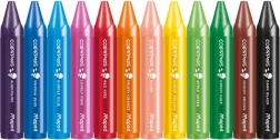 Veilige waskrijtjes voor kinderen vanaf 1 jaar in een set van 12 kleuren. JUMBO driehoekige vorm Ø 13 mm voor de juiste grip, papieren omhulsel tegen vieze handen, intense kleuren en soepel tekenen, niet-giftig.
