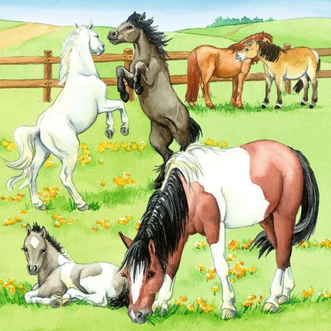 Kinderen leggen meteen drie verschillende scènes – paardrijden met begeleiding, een rustige weide en de verzorging van paarden in de stal. Elk motief brengt een nieuwe uitdaging en plezier bij het puzzelen.