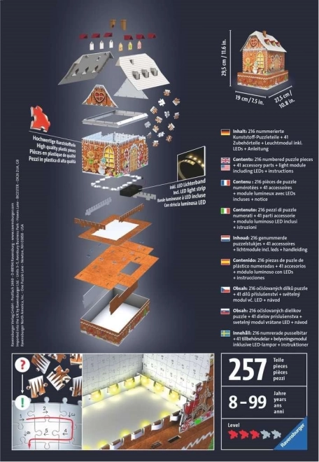 Ontdek de magie van de Ravensburger 3D Puzzel Peperkoekhuis, die kinderen vanaf 8 jaar meeneemt in een wereld van plezier en leren. Deze complexe puzzel met 216 stukjes biedt een unieke ervaring van puzzelen bij nachtverlichting.<>