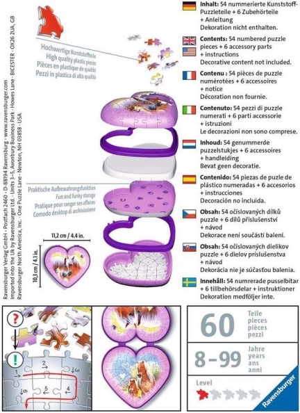 Ontdek de magie van de RAVENSBURGER 3D-puzzel: met nauwkeurig vervaardigde, gebogen en flexibele stukjes maak je een indrukwekkend hartvormig sieradendoosje met een zacht paardenmotief. De constructie is stabiel, staat stevig zonder lijm en dient na het bouwen als een functionele en prachtige decoratie voor de kinderkamer.