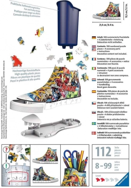 RAVENSBURGER biedt een unieke ervaring met 3D-sneakers die je kunt gebruiken als originele pennenbak voor pennen, kleurpotloden of bijvoorbeeld kwasten. Speciale gebogen of buigzame stukjes die precies op hun plek passen, maken het mogelijk een design-sneaker met motief van Marvel-helden Avengers te bouwen, die er zeer realistisch uitziet. De stukjes zijn gemaakt van stevig plastic en garanderen uitstekende stabiliteit zonder lijm.