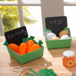 - Fruit, groenten, eieren, honing, melk (thema-accessoires voor het stalletje)