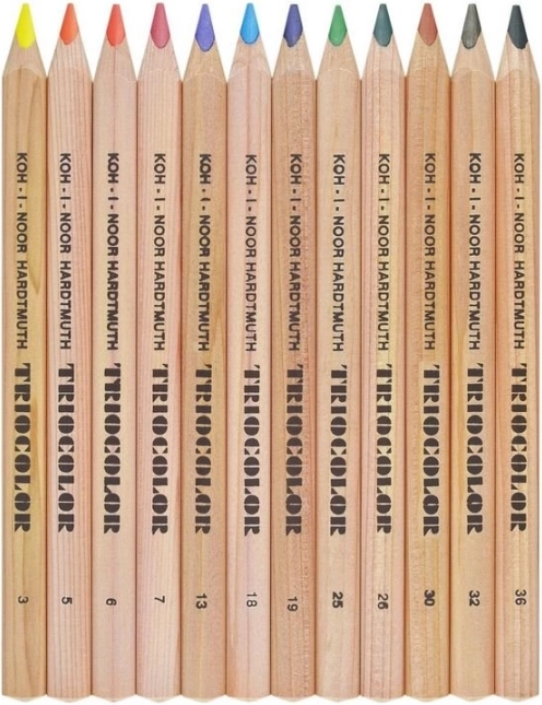 De driehoekige kleurpotloden KOH-I-NOOR Triocolor uit de Art-collectie ondersteunen een correcte pengreep en bieden comfort tijdens het tekenen. Natuurlijk hout helpt bij een zekere grip, beperkt transpiratie van de hand en voorkomt wegglijden over het oppervlak van het potlood. Dankzij de sterke kern geven ze een intense, gelijkmatige kleurafgifte en weerstaan ze ruw gebruik.
