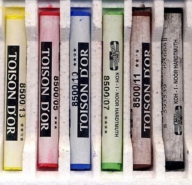 - Droge, poederige artistieke pastels (krijtjes)