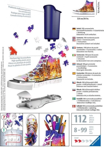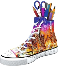 Deze 3D-puzzel biedt een innovatieve en ongewone vorm voor iedereen die van het verbinden van stukjes en modieuze accessoires houdt. Dankzij speciale gebogen en buigzame stukjes die precies op hun plaats passen, kun je een realistisch ogende sneaker bouwen met een New York City-motief – de stad die nooit slaapt.