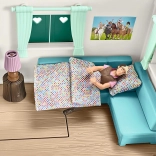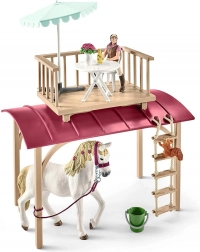 De verpakking bevat: een caravan met terras, een paardenfiguur, een ruiterfiguur en een hele reeks zorgvuldig uitgewerkte accessoires, zoals een bank, parasol, tuinmeubels en meer.