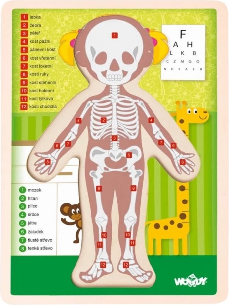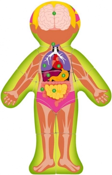 Deze dubbelzijdige puzzel biedt een uniek inzicht in het menselijk lichaam door middel van een meisjesfiguur met twaalf stukjes. Aan de ene kant worden menselijke organen afgebeeld, terwijl de andere kant de structuur van het menselijk skelet laat zien. Het maken van deze puzzel helpt een kind beter te begrijpen hoe het menselijk lichaam werkt: