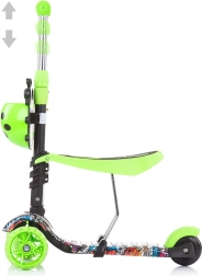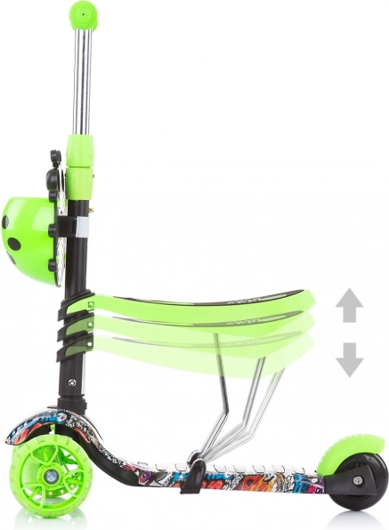 De hoogte stel je eenvoudig in – het zadel heeft 3 posities (22–29 cm) en het stuur eveneens 3 standen voor correcte ergonomie. De voorwielen met gekleurde LED-lichten gaan tijdens het rijden branden en zorgen voor extra plezier en zichtbaarheid. Het praktische voorrekje biedt plaats aan kleinigheden, de rubberen handvatten liggen prettig in de hand en geven goede grip.