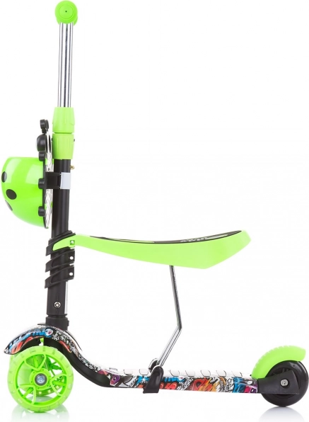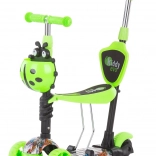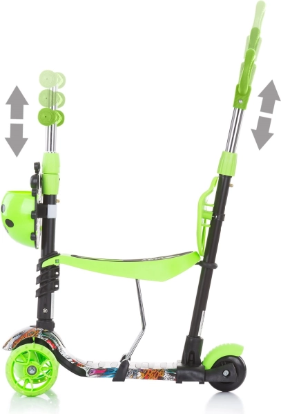 De veelzijdige constructie maakt het mogelijk dat ouders het kind leiden met de duwstang, beginners rijden als op een loopfiets en gevorderden genieten van een volwaardige step.