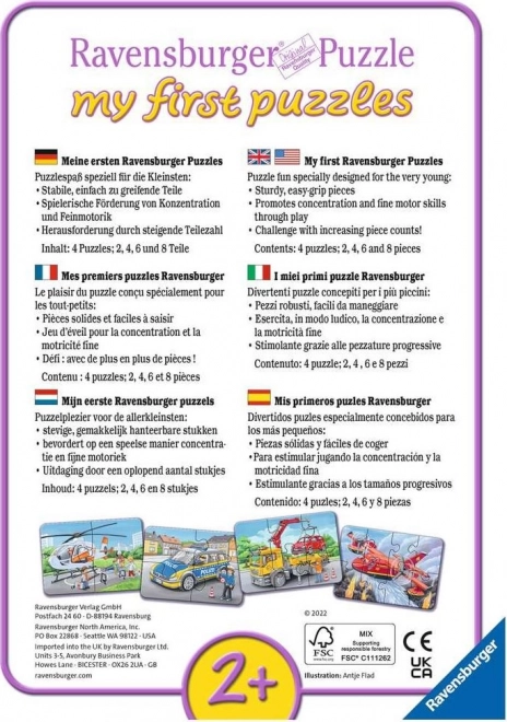 Ontdek je eerste puzzelervaring met de Ravensburger set voor de allerkleinsten. Vier afbeeldingen van hulpdienstvoertuigen met een oplopende moeilijkheid van 2, 4, 6 en 8 stukjes stimuleren de fijne motoriek, concentratie en fantasie. Extra dik karton en stevige stukken maken het hanteren makkelijk en bestand tegen kinderhandjes. Ideaal vanaf 2 jaar.