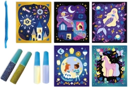 Maak zelf lichtgevende afbeeldingen met gekleurd zand en glitter! Kinderen verwijderen met de meegeleverde spatel de gemarkeerde zelfklevende vlakken. Op deze plekken strooien ze vervolgens glinsterend gekleurd zand dat in het donker oplicht. Overtollig zand kan daarna terug in de bijbehorende tube worden gegoten. Kleine tip om te beginnen: start met zand voor de kleine vlakken en de donkerdere kleurtjes. De set bevat: 5 kaartjes met afbeeldingen, 1 spatel, 4 tubes met glinsterend gekleurd zand. Geschikt voor kinderen vanaf 5 jaar. De Janod Atelier set stimuleert creativiteit, vaardigheden en verbeeldingskracht bij kinderen. Creatief speelgoed neemt niet veel ruimte in, is geschikt voor onderweg en thuis, in goede en minder goede tijden, en houdt kinderen urenlang bezig. Knutselen met verschillende technieken ondersteunt focus en concentratie, natuurlijk onderzoekend leren en artistieke vaardigheden.