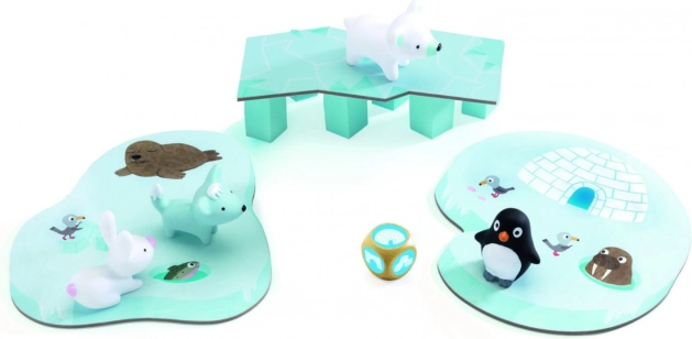 De set bevat 4 gedetailleerde dierenfiguren (pinguïn, ijsbeer, poolvos, wit konijntje), 3 speelborden met ijsmotief, speciale onderdelen zoals wakken, een brug, een iglobord en 6 pilaren. Dankzij de eenvoudige regels en aantrekkelijke uitvoering is het spel ideaal als eerste coöperatieve ervaring voor kleuters.