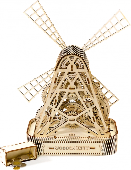 Nadat het is opgewonden door een rubberaandrijving, beginnen de wieken van de molen te draaien, en dankzij het vliegwiel tussen de tandwielen geniet je tot een minuut lang van beweging met één winding. De geïntegreerde opbergruimte in de standaard biedt praktische toepassingen als spaarpot of opbergruimte voor kleine spullen.