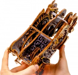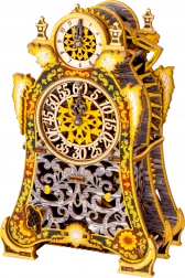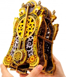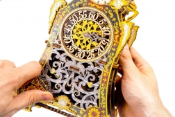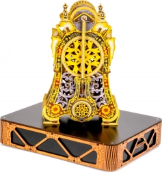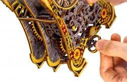 Het model is gemaakt van ecologische berkenmultiplex en wordt zonder lijm of gereedschap in elkaar gezet. Tijdens het bouwen leer je de principes van overbrengingen, elastiekmotoren en de werking van een klokmechanisme van heel dichtbij kennen.