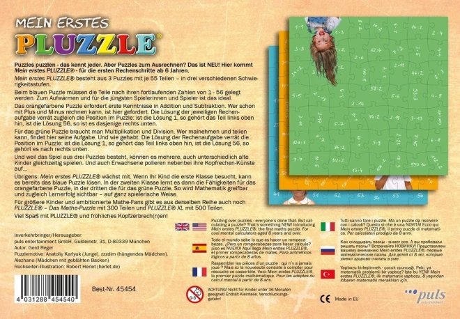 Ontdek de eerste wiskundepuzzels die van rekenen een speelse uitdaging maken. Drie afzonderlijke afbeeldingen begeleiden kinderen van het herkennen van cijfers tot eenvoudige rekenkundige bewerkingen. De puzzels kunnen zonder voorbeeld worden gelegd voor extra uitdaging, of met het voorbeeld uit het doosje voor een meer ontspannen ervaring.