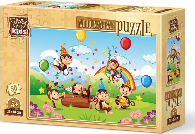 Geniet van een kwaliteitsvolle houten puzzel met een vrolijk apenfeest-motief. De stukjes zijn gestanst uit veerkrachtig Afrikaans hout, waardoor ze duurzaam zijn en goed in elkaar passen. De puzzel is perfect voor de ontwikkeling van fijne motoriek, logisch denken en geduld.