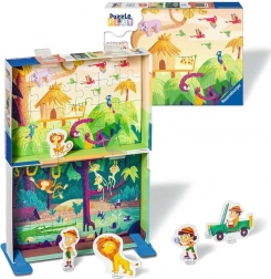De set Ravensburger Puzzle & Play: Avontuur in de jungle biedt dubbel zoveel plezier – eerst het leggen van twee kleurrijke puzzels (elk met 24 stukjes) en daarna spelen in het theatertje met de meegeleverde figuurtjes. Door beide delen van de doos te verbinden creëer je eenvoudig een stabiele scène waarin de puzzels als achtergrond worden geplaatst.