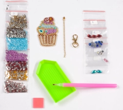 In de verpakking zit alles wat je nodig hebt: een basis met cupcake-motief, gekleurde steentjes en een applicator met waspunt. De afgewerkte hanger is perfect als decoratie voor sleutels of als stijlvolle accessoire voor je rugzak. Het knutselen bevordert concentratie, fijne motoriek en brengt rustgevende maakplezier.