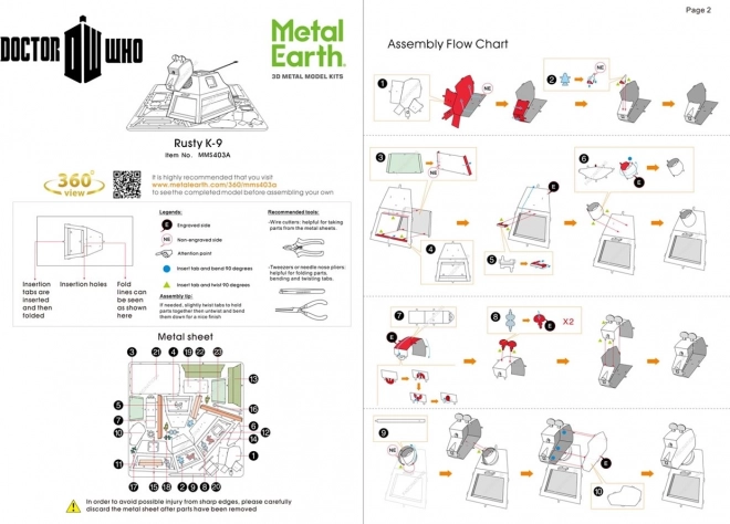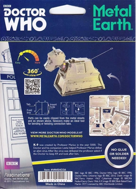 Beleef het plezier van precies bouwen met de metalen 3D-puzzel Metal Earth: Rusty K-9. Van platte stalen plaatjes creëer je een realistisch model van de iconische robothond uit Doctor Who, perfect als verzamelobject en als designdecoratie op bureau of plank. Lasergravure geeft het oppervlak levensechte details en een metallic glans.