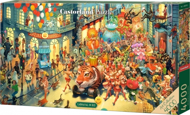 Ontdek de betoverende wereld van samba en maskers met de premium puzzel van 4000 stukjes Carnaval in Rio, naar een illustratie van Waldemar Kazak. Je vindt er mysterieuze figuren, verborgen symbolen en originele kostuums die samen een unieke, satirische scène vormen. Voor makkelijker puzzelen bevat de verpakking een extra illustratieve voorbeeldafbeelding.